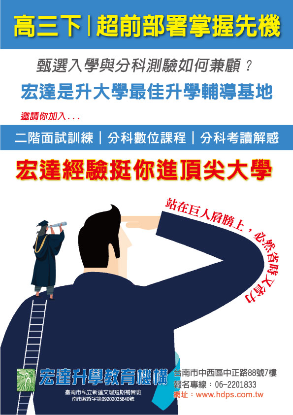 (114)年宏達再戰學測重考班4月12日正式開課,搶先開跑,強化各考科基礎。報名專線:06-2201833